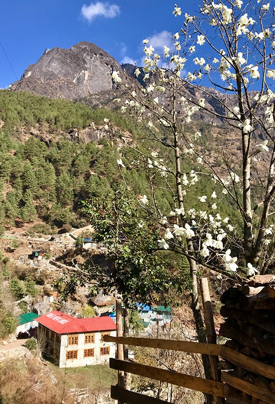 Vi följer vägen längs Dudh Koshi-floden och förbi stora skogsområden fulla av barr- och rhododendronträd tills vi kommer till en by med namnet Monjo. Här stannar vi och äter en god lunch.