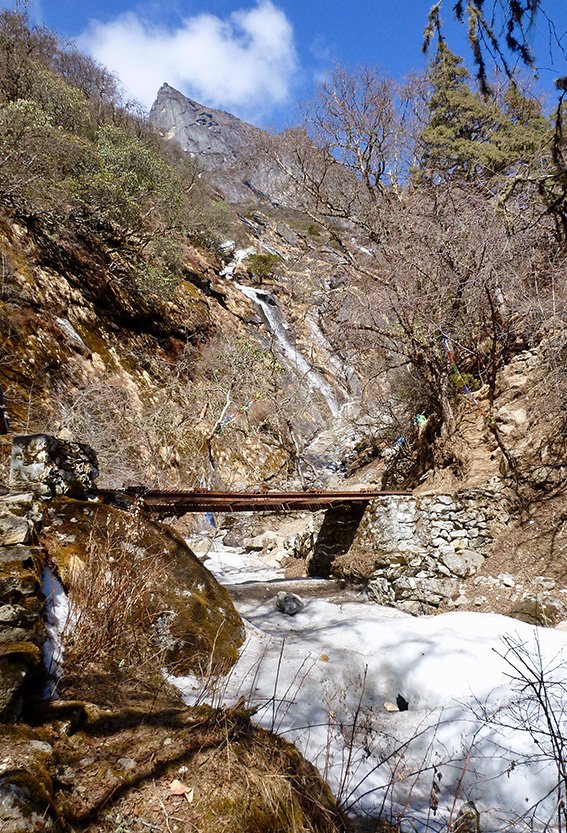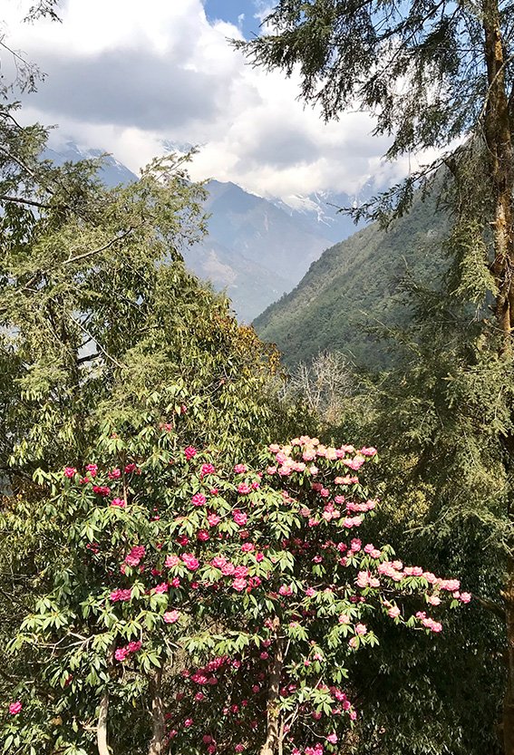 Efter lunch är vi fulla av energi igen och vandrar genom härlig rhododendronskog, med flera vattendrag och vattenfall längs vägen. Vi tar oss de sista 400 höjdmetrarna upp till dagens slutmål, Dole, där vi nu har passerat 4 000 meters-strecket på vår resa upp i bergen.