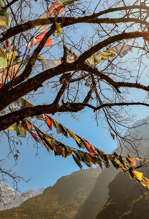 Strax efter vi startar dagens vandring är det dags att svänga av från huvudstigen. Nu lämnar vi turistvägen upp till Everest bakom oss och viker istället av upp mot Gokyosjöarna. Efter två timmars klättring är vi på krönet av bergsryggen, där vi tar fikapaus i sherpabyn Mongla. Därefter väntar ett gäng serpentinsvängar ned på andra sidan ner till lunchstoppet i Phortse Tanga.